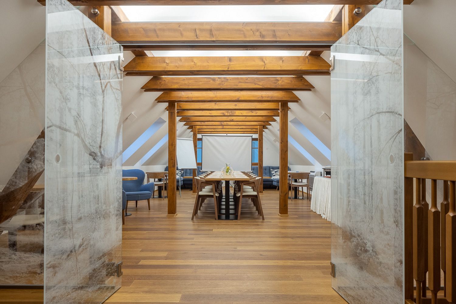 Klimatizovaný oddělený salonek pro 25 osob s kompletním technickým vybavením. K dispozici vám bude vše potřebné – projektor, plátno, flipchart s psacími potřebami. Útulné podkroví ovšem můžete využít i méně tradičně – například pro ranní lekci jógy.